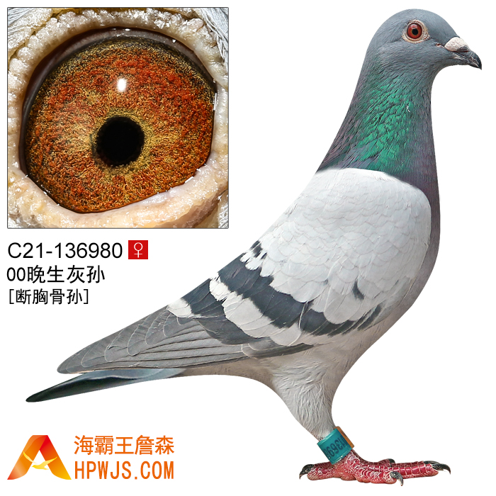 | 曾外祖母 B94-6261231 | 子代 詹森清舍拍卖种鸽 孙代 詹森清舍拍卖种鸽 09年詹森鸽舍“第一配对”雌" 01台北县永和新和支会春季综合7位 03年汕头市鸽会冬季福安500公里组赛 47组 第7名 第四届海霸王专棚赛300公里资格赛8名 第五届海霸王专棚赛第4关180公里8名 1999年台北县中和全和支会春季五关综合5位 詹森清舍拍卖种鸽