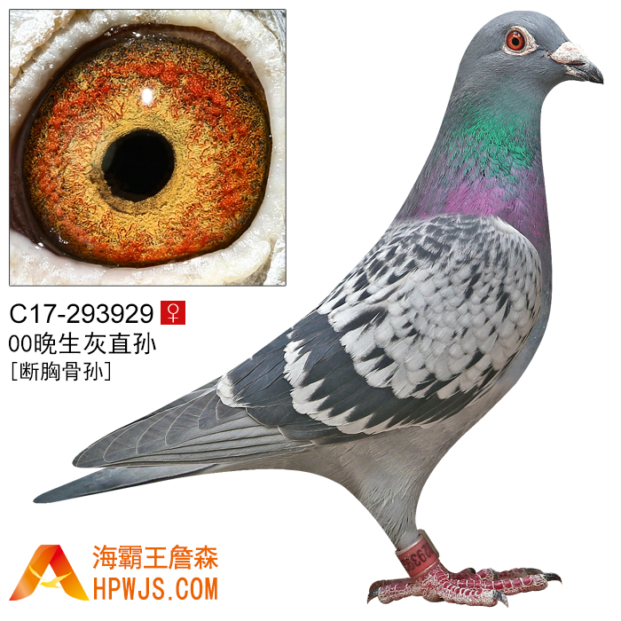 父亲 C17-293916 | | 母亲 C10-319220 | 本身 11年汕头金平鸽会春季福安500公里幼鸽赛多羽 2100羽 冠军 11年汕头金平鸽会春季福安500公里幼鸽赛 2100羽 亚军 11年汕头金平鸽会春季福安500公里当年足环赛 1031羽 季军 11年汕头金平鸽会春季福安500公里金平杯 1031羽 季军 11年汕头金平鸽会春季福安500公里常规赛 1031羽 5名 孙代 19年秋广州浩羽(黄埔)公棚500公里决赛 3052羽 332名