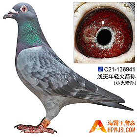 | 母亲 C15-265967 | 平辈子代 第八届海霸王专棚赛300公里3名 15年秋陕西雅翔公棚480公里决赛 1987羽 19名 16年秋汕头飞翔俱乐部300公里莆田30元指定 亚军 16年秋汕头飞翔俱乐部300公里莆田总鸽 亚军 16年秋汕头飞翔俱乐部530公里霞浦足环赛 96名 16年秋广东汕头信源公棚500公里决赛 2940羽 222名 16年秋广东汕头信源公棚300公里热身赛 4060羽 226名 20年春广东欣洋公棚230公里速度赛 2927羽 17名 20年春广东欣洋公棚280公里预赛 2498羽 242名
