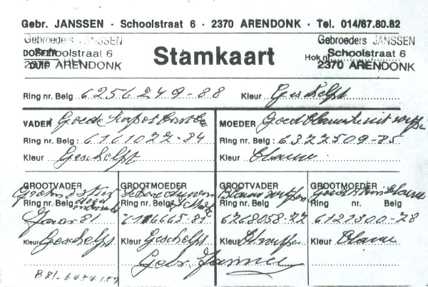 | 曾祖父 B70-6243257 | 孙代 六次冠军 1990-01年元月任詹森兄弟要角种公鸽11年