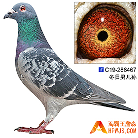 | 母亲 C14-246511 | 本身 14年迎新汕头华翔俱乐部500公里福安 归巢 第九届海霸王专棚赛300公里归巢 子代 17年秋重庆齐圣翔公棚第四届预赛 3875羽 5名(当天仅归24羽) 18年秋四川红军公棚281公里预赛 4907羽 165名 18年秋四川红军公棚437公里决赛 3352羽 271名 平辈子代 18年秋广东恒通公棚180公里热身赛 6589羽 78名 18年秋广州浩羽(黄埔)公棚300公里速度赛 4221羽 35名 18年秋广州浩羽(黄埔)公棚360公里预赛 3697羽 65名 19年秋福建海峡公棚285公里 4752羽 季军 19年秋广东潮州恒通公棚500公里决赛 2644羽 355名 19年秋广东潮州爱亚卡普483公里决赛 2205羽 330名 20年秋广州浩羽(黄埔)公棚360公里预赛 2696羽 12名 20年秋广东汕头龙湖公棚380公里预赛大家乐500 入赏 20年秋广东汕头龙湖公棚380公里预赛大家乐200 入赏 20年秋广东汕头龙湖公棚380公里预赛 2763羽 63名