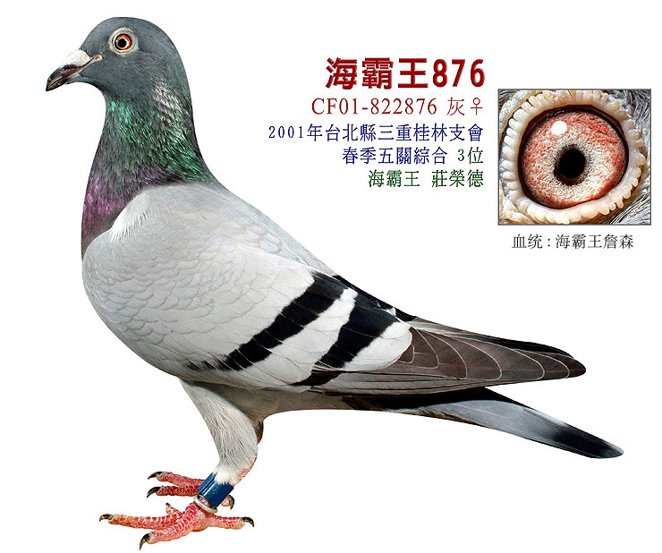 | | 曾外祖父 T92-07849 | 子代 1995年台北市吉林支会秋季五关综合优胜 孙代 02年汕头升平鸽会冬季福安500公里锦标赛 151羽 7名 辽宁鹤乡公棚决赛205名 第一届海霸王专棚赛第1关7名 第一届海霸王专棚赛第3关2名 98秋睦翔综合9位 99冬大基隆综合3位